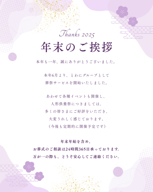 本年6月より、とわにグループとして葬祭サービスを開始し、多くの方との新たなご縁に恵まれた一年となりました。