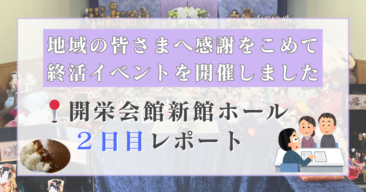 このたび、開栄会館 新館ホール(埼玉県日高市森戸新田106)にて、葬儀イベントを開催いたします。実際に使用される花祭壇の展示や、人気の遺影写真撮影会、キッチンカーなど盛りだくさんの内容です。ご家族やご友人とお気軽にお越し […]